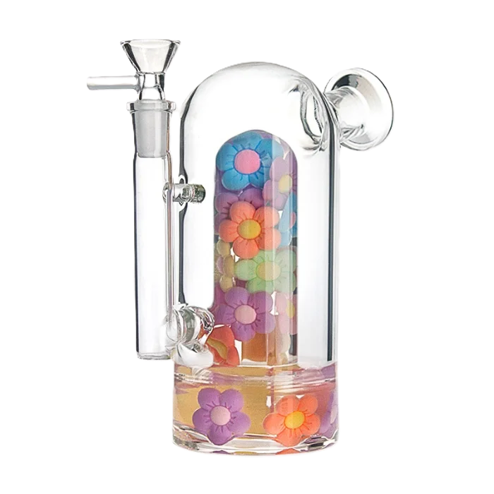 Бонг має висоту 18 см, що робить його компактним і зручним для використання як удома, так і в дорозі. Виготовлений із міцного скла з декоративним квітковим принтом «Flowers», який надає пристрою оригінального вигляду. Конструкція продумана до дрібниць: широке дно для стійкості, вигнута форма для комфорту та ефективна фільтрація диму.