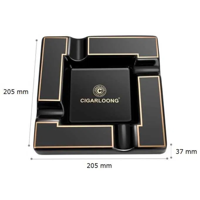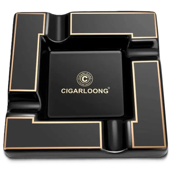 Попільничка для сигари CIGARLOONG (Чорна) – стильний аксесуар, створений для справжніх поціновувачів тютюнової культури. Виготовлена з міцної кераміки, вона поєднує елегантність і практичність. Чотири зручні виїмки дозволяють комфортно розмістити декілька сигар одночасно, що робить її ідеальним вибором для домашнього використання, лаунж-зон або дружніх зустрічей. Чорний корпус із золотистими вставками підкреслює сучасний дизайн та надає виробу розкішного вигляду.