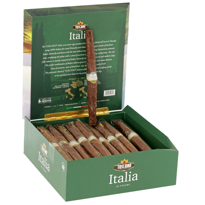 Toscano Italia — це справжній символ італійської культури куріння, створений із добірного табаку сорту Kentucky, який проходить спеціальне fire-cured сушіння та витримку, що надає сигарам глибокого, насиченого смаку з деревними і пряними нотами. Кожна сигара має характерний аромат з легкою солодкістю та димною глибиною, що робить її унікальною у своєму класі.